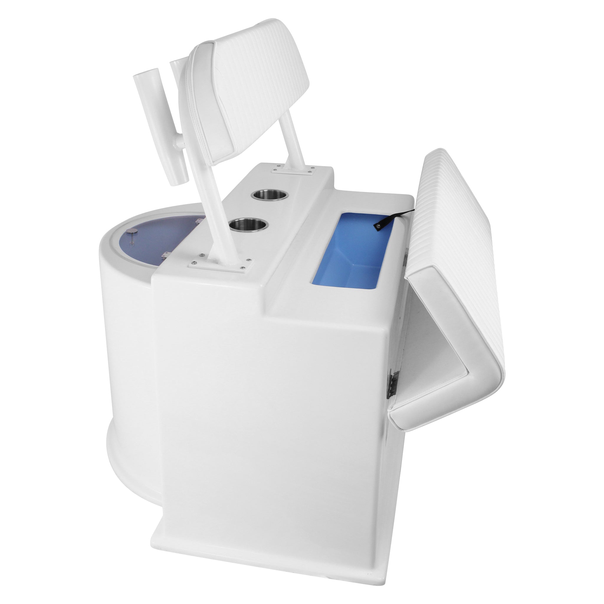 This Deluxe Leaning Post w/Livewell comes with all Stainless Steel (corrosion-proof) hardware, white pleated upholstery and ultra-violet resistant white gelcoat. The seat opens for storage and has a 40 gallon round livewell. It also comes with 4 Stainless Steel Rod Holders or cup holders. The inside of the livewell has a blue gelcoat, a clear lid and a backrest.