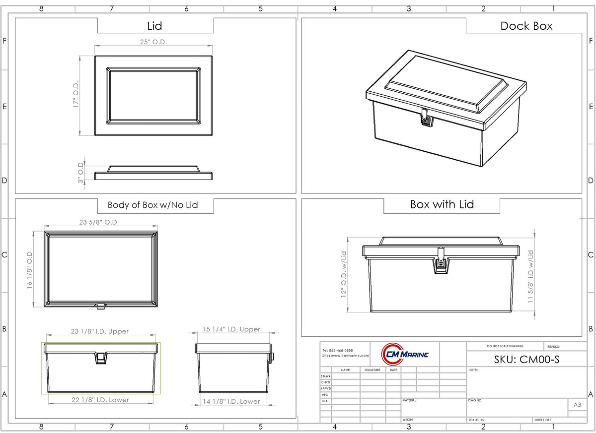 Our C&M Dock Boxes are high-end, high-quality, affordable products, hand built in the USA. These “Heavy Duty” boxes are constructed for long lasting durability with a layer of ultra-violet resistant white gelcoat, a double layer of fiberglass and resin, and then another layer of gelcoat on the inside with a layer of webbing. The walls are approximately 3/16” thick.