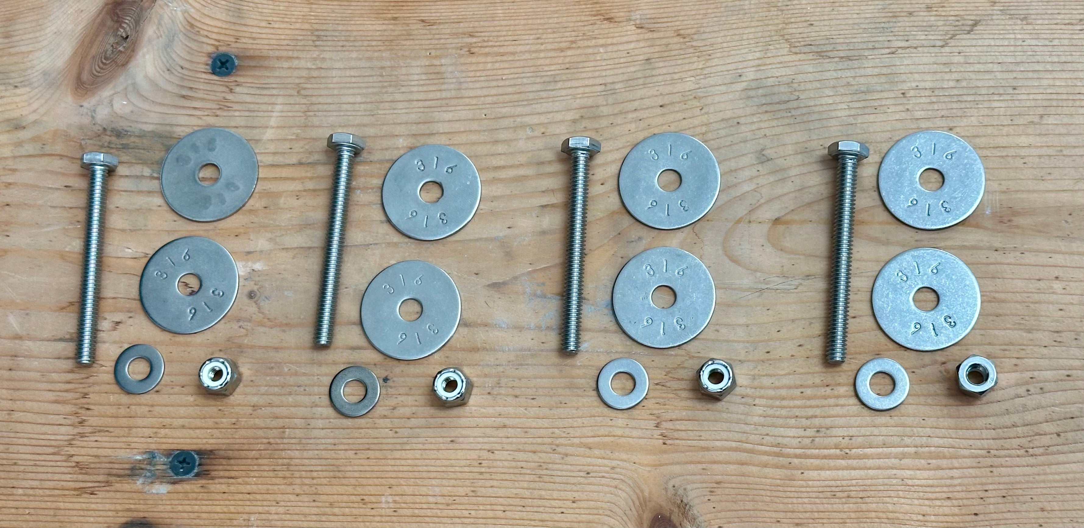 Through Bolts: Choose this option if you have access to the underside of your dock, as these are tightened from the underside. While Lag Bolts are plenty secure, these will provide more holding power. Set comes with 4 x 1/4-20 2.5" Tab Bolts, 8 x Fender Washers, 4 Flat Washers, and 4 Locknuts - all 316 stainless. Use Fender washers for dock box mounting, or flat washers for pedestal and other applications.