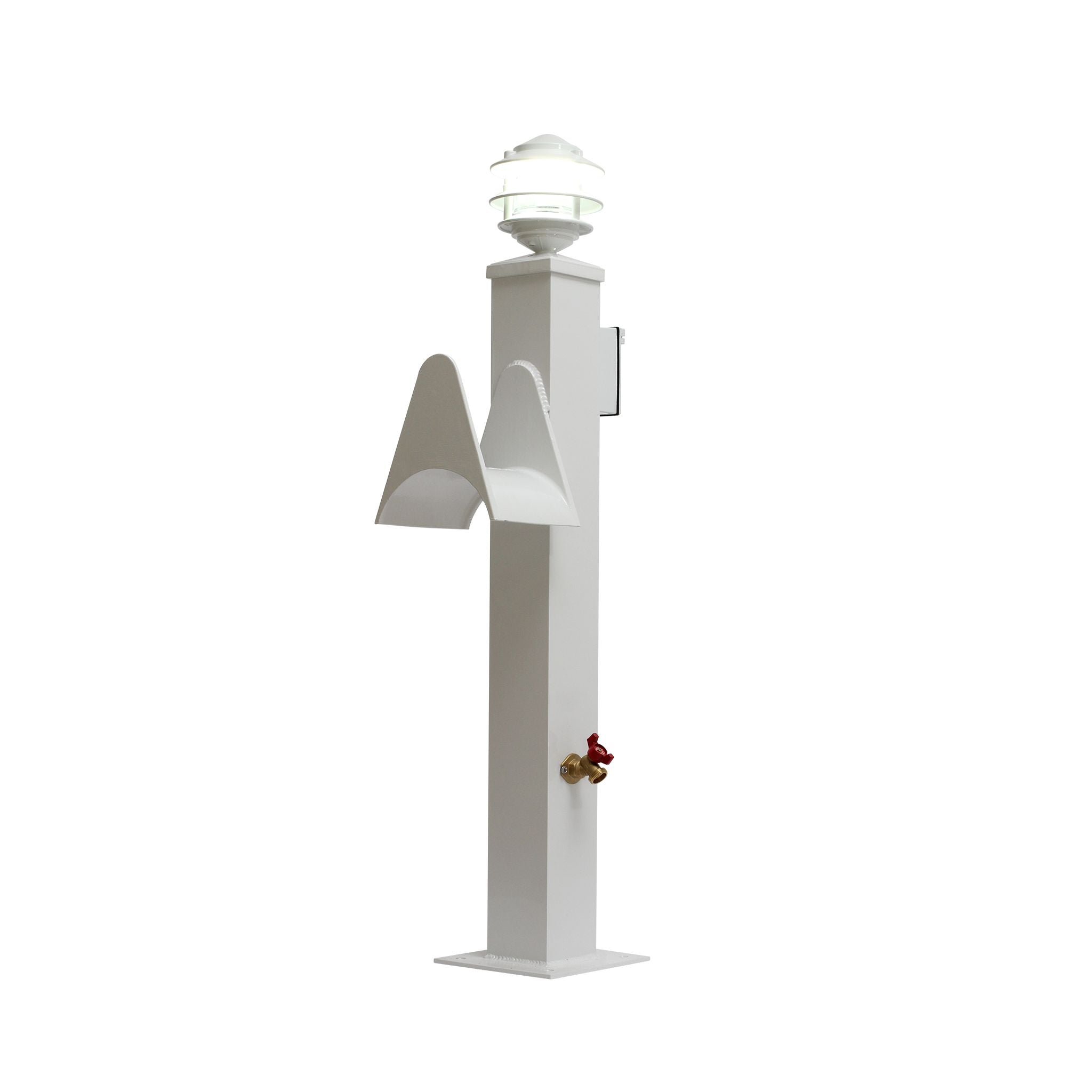Give your dock, garden, or pathway a refined marine look with our high-end marine-grade water and electric pedestal with pagoda light. Made in the USA with marine-grade all-aluminum welded construction with a tough powder coat finish. High quality welds ensure a lifetime of use. The light is a 110V with lime crystal glass globe suitable for use in wet locations.